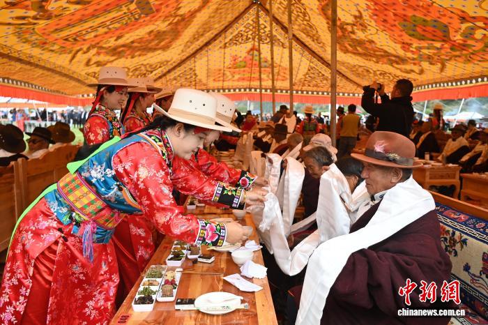 图为身穿“三格毛”的藏族姑娘为长寿老人端“藏王宴”菜品。中新社记者 九美旦增 摄
