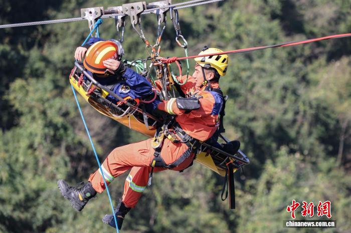图为消防人员安全转移“伤员”。覃坤林 摄