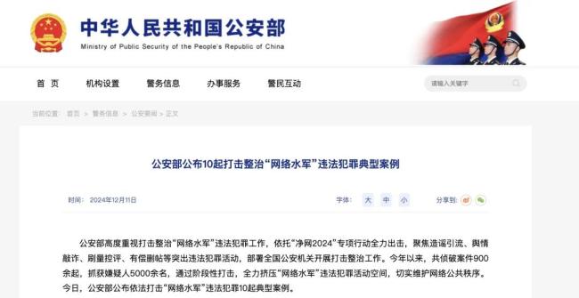 2024年12月,公安部公布10起打击整治“网络水军”违法犯罪典型案例。聚焦造谣引流、舆情敲诈、刷量控评、有偿删帖等突出违法犯罪活动,部署全国公安机关开展打击整治工作。全年,共侦破案件900余起,抓获嫌疑人5000余名,通过阶段性打击,全力挤压“网络水军”违法犯罪活动空间。