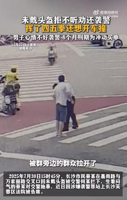 近日,一男子殴打交警的视频引起关注。7月30日,在湖南长沙嘉雨路与万家丽路交叉口,市民蔡某因未戴头盔被交警何某拦下。蔡某情绪激动,对交警施暴,挥了四五拳,并试图开车撞向交警。最终,蔡某因涉嫌袭警罪被长沙芙蓉区法院判处8个月有期徒刑。