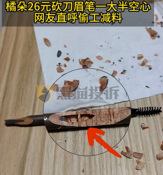 对此,橘朵客服回应:是特意将笔尾设计为空心,防止木材开裂,同时也为眉刷预留一定的位置,为了方便您使用后整理眉毛,让妆效更精致自然。笔芯净含量是足量的,可以使用3个月以上。