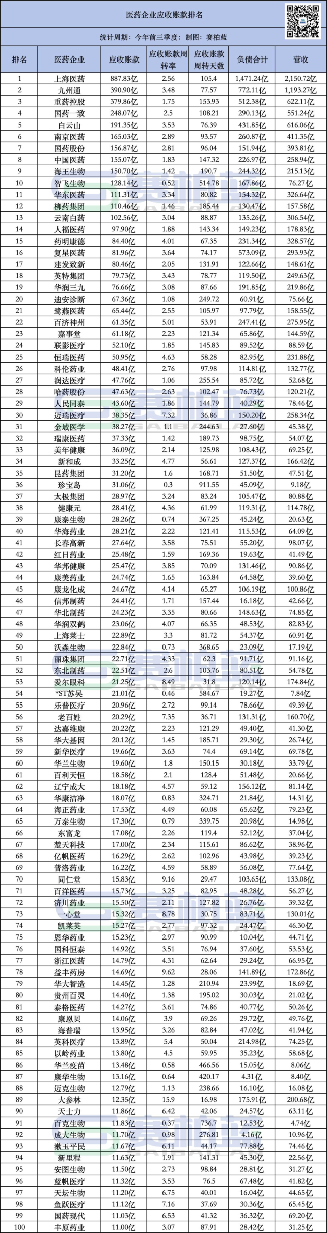 医药企业应收账款排行来了!(附名单)
