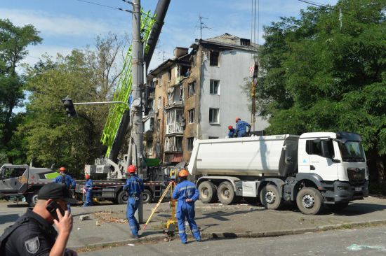 7月10日,在乌克兰基辅市舍甫琴科夫斯基区,救援人员拆除在空袭中受损的居民楼。新华社发(彼得·德鲁克摄)