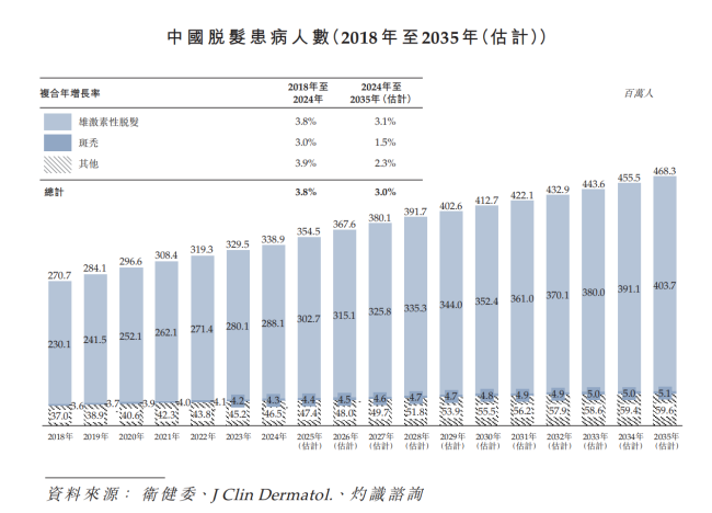 数据显示,我国脱发患者由2018年的2.71亿人增至2024年的3.39亿人,复合年增长率达3.8%,预计2035年将达到4.68亿人。