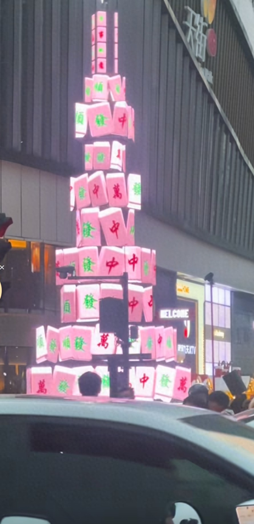 在成都的一处商圈,一棵造型独特的圣诞树拔地而起。这棵树可不是普通的圣诞树,它是由一块块麻将牌堆叠而成的。麻将块上印着“中”“发”“万”“顺”这些大家熟悉的麻将字样,顶部还有一颗闪亮的星形装饰。更绝的是,这棵麻将圣诞树还会“变色”,一会儿是清新的白色,一会儿是粉嫩的粉色,偶尔还会变成亮眼的绿色,不同颜色切换时,麻将的组合图案也跟着变化,那叫一个炫酷。